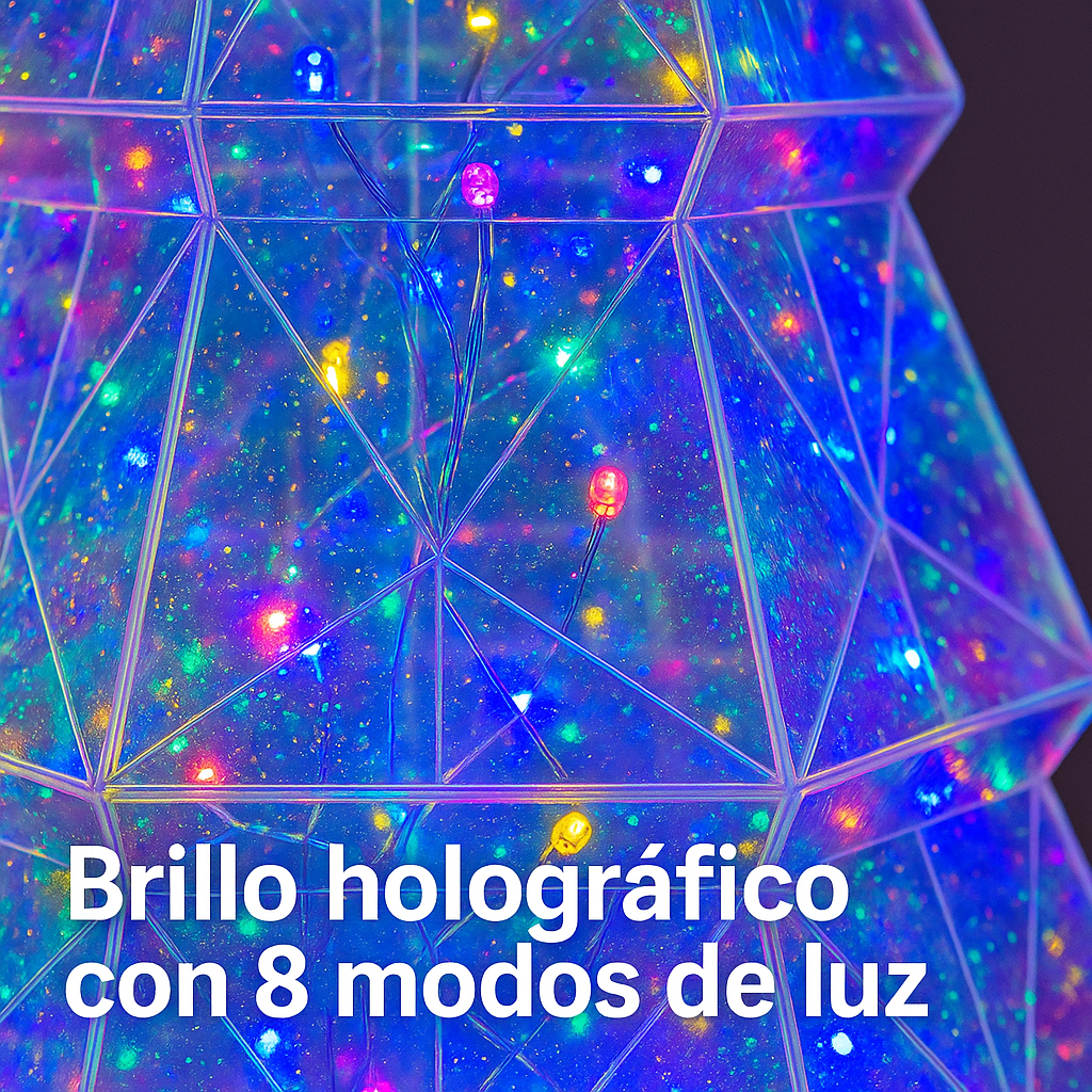 El árbol cuenta con luces LED RGB integradas que se reflejan en paneles acrílicos prismáticos, creando un efecto holográfico de colores cambiantes. Puedes ajustar el modo de iluminación con el control remoto o directamente desde el botón de encendido.