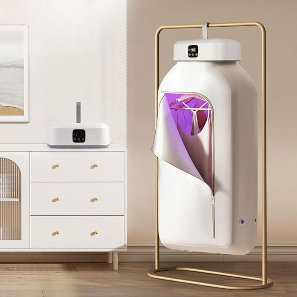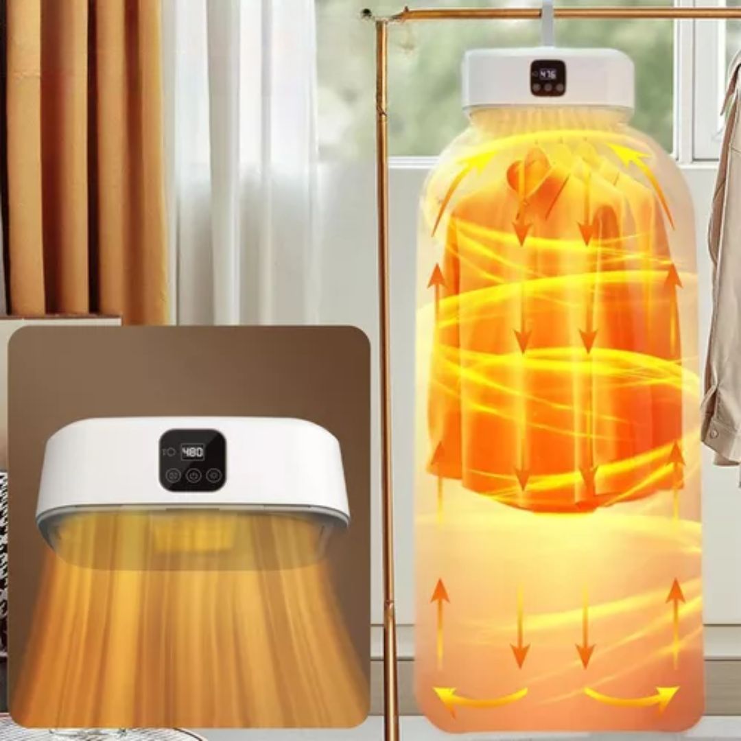 Secador de ropa portátil con sistema de aire caliente y pantalla digital.